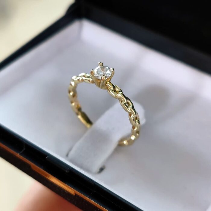 Delicadeza e brilho em um design único. O Anel Solitário Orion é a escolha perfeita para quem deseja expressar amor com sofisticação e originalidade. Confeccionado a partir de moeda antiga, ele se destaca pelo seu aro com acabamento entrelaçado, que remete a laços eternos e à união verdadeira. Sua zircônia central lapidada é segura por quatro garras delicadas que garantem brilho intenso e destaque absoluto. Um modelo leve, versátil e cheio de personalidade. ✨ Características do produto: Material: Moeda antiga (com cor dourado natural) Design: Aro entrelaçado em estilo corrente Pedra: Zircônia 4mm central de alto brilho Acabamento: Polido e detalhado artesanalmente Modelo: Orion – moderno, romântico e exclusivo Acompanha estojo de luxo 💍 Uma joia para marcar histórias. Ideal para pedidos de noivado, aniversários de namoro ou para quem deseja surpreender com elegância, o Anel Orion simboliza compromisso e beleza em cada detalhe.