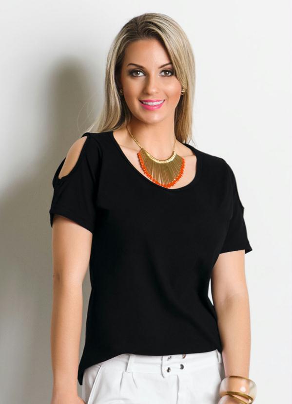 Blusa Dinaira confeccionada em malha de algodão com recortes nos ombros. Cor: Preto. Tamanhos: P,M,G,GG.