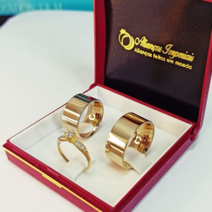 Par Alianças de Moedas Antigas 10mm Retas + Anel Solitário Rainha