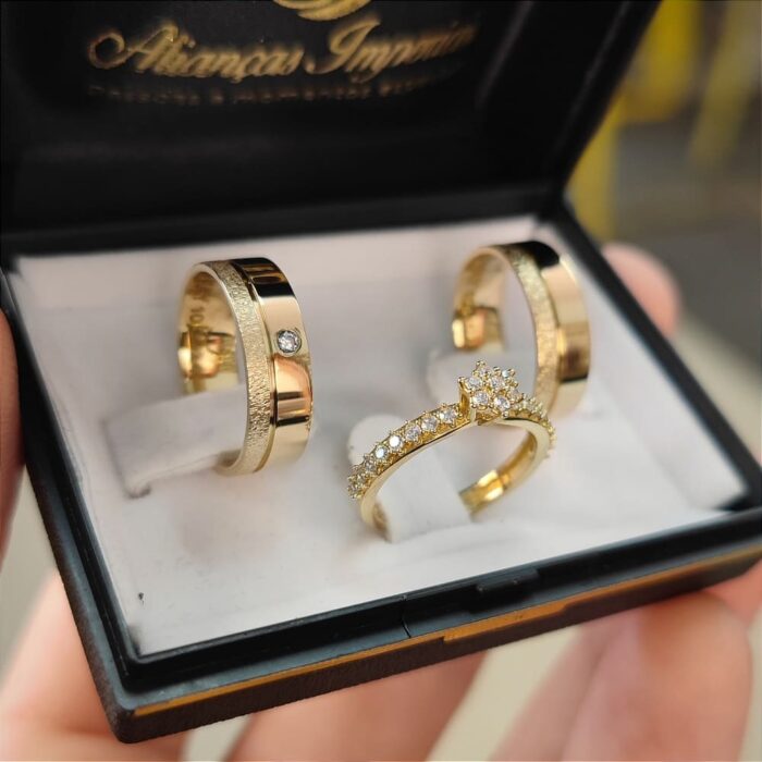 Par de alianças 6mm mod. R1 Granitada com Pedra + anel Imperatriz