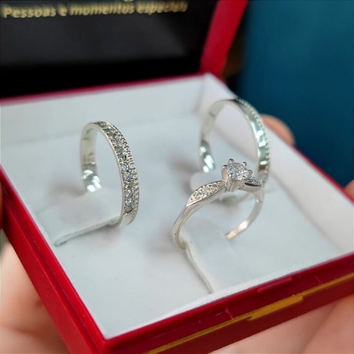 Par de alianças em Prata 3mm mod. Divine + anel solitário Rainha